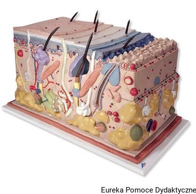 Model przekroju skóry ludzkiej i struktur wewnętrznych w trzech różnych płaszczyznach w 70–krotnym powiększeniu. Uwidocznione są wszystkie warstwy skóry, włosy, gruczoły potowe i łojowe, receptory oraz nerwy i naczynia.