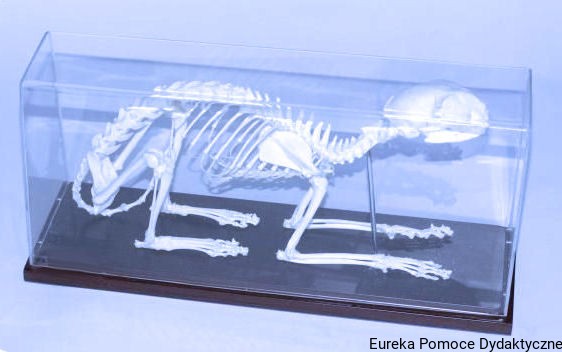 Naturalny szkielet kota umieszczony na podstawie jest bardzo przydatną pomocą dydaktyczną.