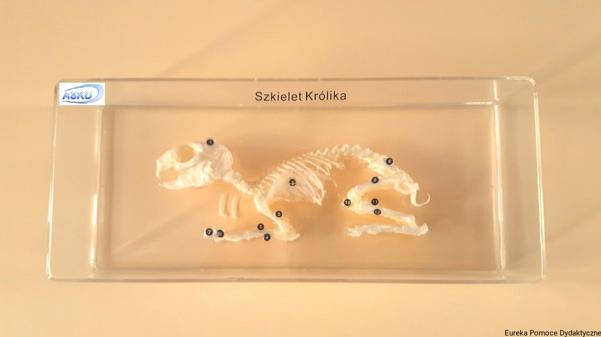 Naturalny szkielet królika z numeracją kości jest bardzo przydatną pomocą dydaktyczną.