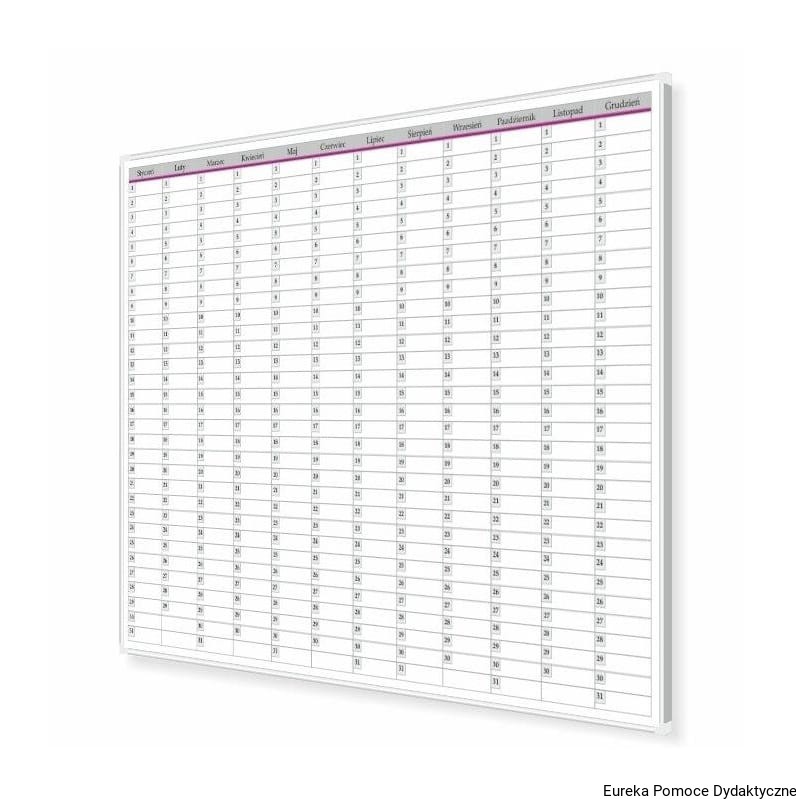 Tablica do planowania roku magnetyczna suchościeralna. Nadruk wykonany w technologii uniemożliwiającej jego usunięcie. Planer oprawiony w ramę aluminiową anodowaną, narożniki plastikowe. Powierzchnia tablicy do pisania markerami suchościeralnymi. Możliwość mocowania kartek za pomocą znaczników magnetycznych.
