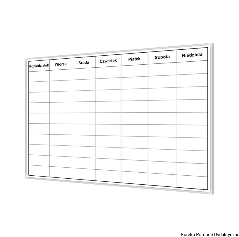 Tablica do planowania tygodnia DT magnetyczna suchościeralna. Nadruk wykonany w technologii uniemożliwiającej jego usunięcie. Tablica oprawiona w ramę aluminiową anodowaną, narożniki plastikowe. Powierzchnia tablicy do pisania markerami suchościeralnymi. Możliwość mocowania kartek za pomocą znaczników magnetycznych.