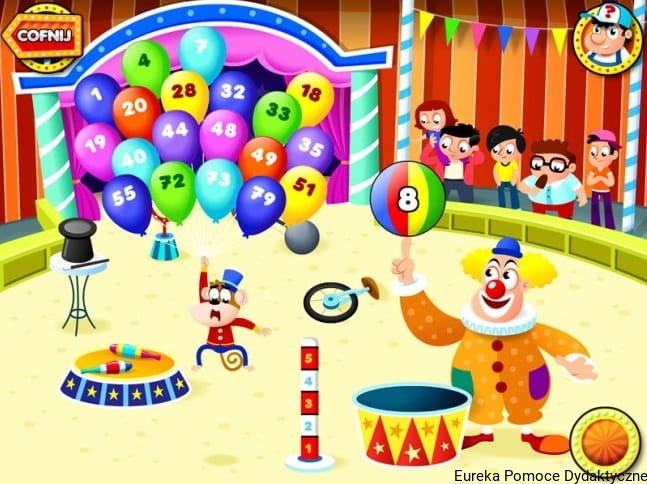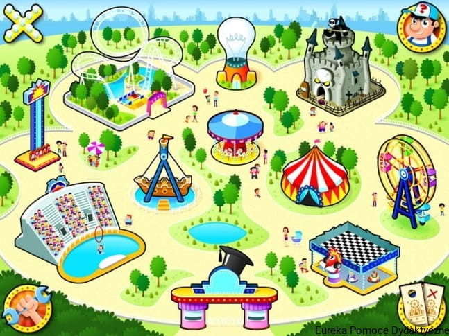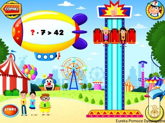 W wesołym miasteczku znajduje się dziesięć różnych atrakcji, służących dokładnemu przećwiczeniu tabliczki mnożenia. Każda atrakcja umożliwi to dzieciom w inny sposób np. na kolejce górskiej policzą wszystkie dzieci jadące wagonikami, w cyrku będą określały wielokrotność danej liczby, w automacie z żarówkami rozświecą jedynie te żarówki, które umieszczone są w odpowiednim miejscu, zaś w katapulcie usadowią tylko tych bohaterów, którzy reprezentują liczby odpowiadające zadaniu, natomiast, żeby przejechać przez „nawiedzony zamek” będą musiały wskazać poprawne wyniki działań, zaś w delfinarium rozwiążą zadanie tekstowe.