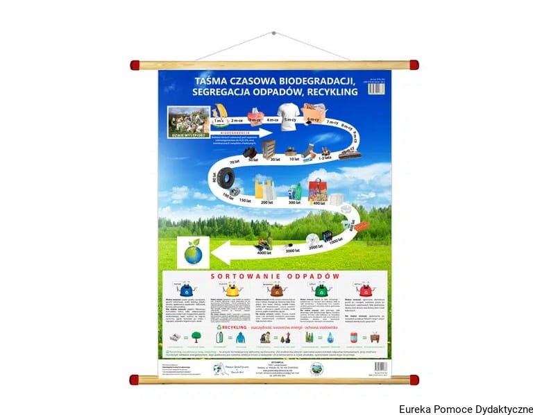 Taśma czasowa biodegradacji pospolitych odpadów, to planszowa pomoc dydaktyczna uświadamiająca potrzebę wyrabiania proekologicznych zachowań i nawyków. Zwrócenie uwagi na to, iż beztroskim śmieceniem w sposób nieodpowiedzialny obciążamy środowisko na setki i tysiące lat – dydaktyczny apel wskazujący istotę potrzeby selektywnej zbiórki odpadów, dzięki której utrzymujemy porządek ale przede wszystkim chroniąc środowisko oszczędzamy energię.