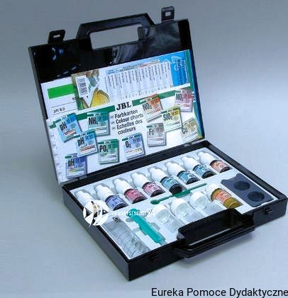 W zestawie znajdują się naczynka pomiarowe, odczynniki i skale.