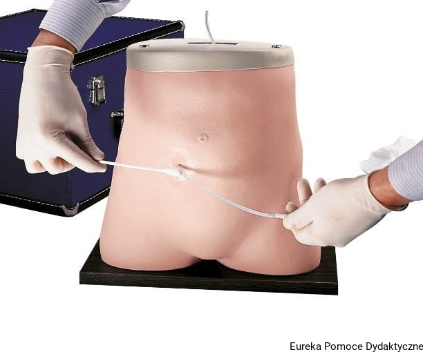 Trenażer do dializy otrzewnowej przedstawia okolice miednicy i brzucha. Realistyczny model torsu pomocny podczas nauki, demonstracji i ćwiczeń Ciągłej Ambulatoryjnej Dializy Otrzewnowej (CAPD). W zestawie znajduje się cewnik Tenckhoffa oraz walizka transportowa.