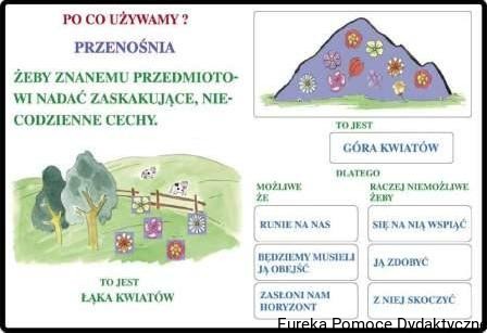 Jest to środek dydaktyczny niezbędny we wprowadzaniu i utrwalaniu pojęcia tropów stylistycznych w szkole podstawowej zgodnie z reformą programową i kontynuowany w gimnazjum. Zakres prezentowanych tropów stylistycznych został ograniczony do czterech podstawowych kategorii: epitet, porównanie, przenośnia i synekdocha. Wprowadzane terminy są definiowane w sposób przejrzysty dla ucznia, a więc taki, który pozwala na wyraźne rozróżnienie poszczególnych tropów, jako oddzielnych kategorii. Wykorzystano przede wszystkim związki wyrazowe występujące w mowie potocznej. Poszczególne przykłady zostały uzupełnione rysunkami, które w pewnym uproszczeniu obrazują proces powstawania znaczeń charakterystycznych dla poszczególnych tropów stylistycznych.
