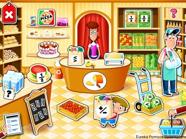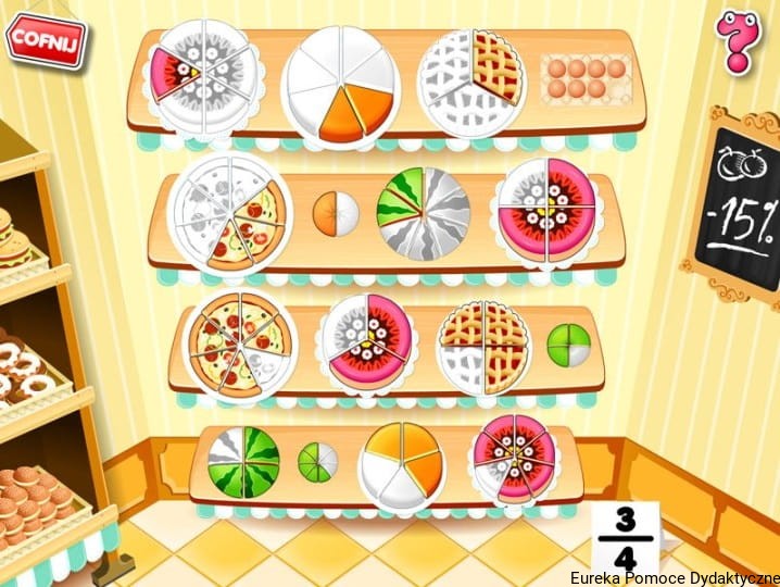 Uczeń znajduje się w sklepie spożywczym, gdzie czekają na niego zadania o różnym ukierunkowaniu, z różnym sposobem ćwiczenia umiejętności: od podstawowego poznawania ułamków (wybieranie obrazków odpowiadających ułamkowi, oznaczanie liczby porcji produktów spożywczych według ułamków czy dobieranie w pary ułamków i obrazków), przez określanie części całości (liczba skrzynek na półkach, liczba kawałków owocu), dalej porównywanie ułamków (przedstawionych liczbowo lub przy pomocy obrazków), przedstawienie ułamków na osi liczbowej (ważenie produktów spożywczych), aż po dodawanie, odejmowanie oraz proste skracanie i rozszerzanie ułamków. Na szczególną uwagę zasługuje zadanie polegające na krojeniu produktów spożywczych, w którym trzeba albo odkroić określoną cześć produktu, albo obliczyć odkrojony kawałek produktu.