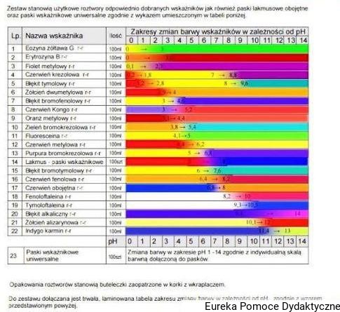 Do zestawu dołączana jest trwała, laminowana tabela zakresu zmiany barwy w zależności od pH.
