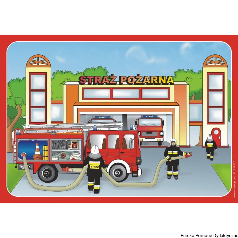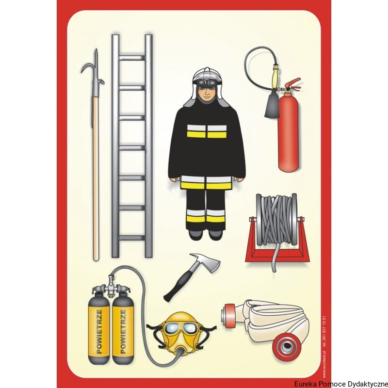 1. Strażak w stroju do akcji oraz podstawowe narzędzia wykorzystywane przy gaszeniu ognia: gaśnica, wąż strażacki, drabina, bosak, maska z tlenem.