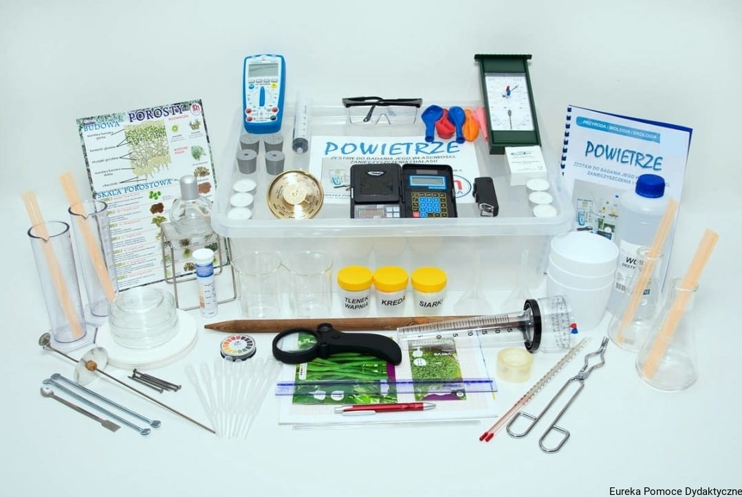 Zestaw zawiera liczne materiały i przyrządy dobrane w taki sposób, aby zapewniły bazowe wyposażenie przy przeprowadzaniu badań zarówno w szkolnym laboratorium, jak i w terenie.