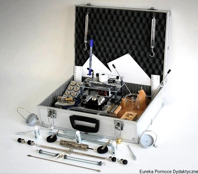 Zestaw dydaktyczny złożony z elementów przeznaczonych do montażu układów doświadczalnych z działu mechaniki. Umożliwia wykonanie 25 opisanych w instrukcji ćwiczeń.