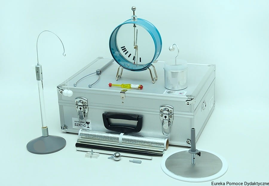 Zestaw pozwala na realizację szeregu doświadczeń z zakresu elektrostatyki obejmujących m.in.:
