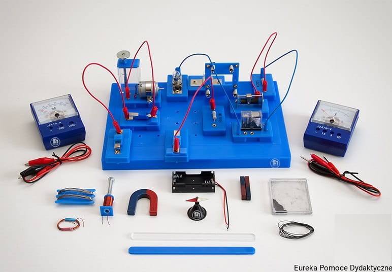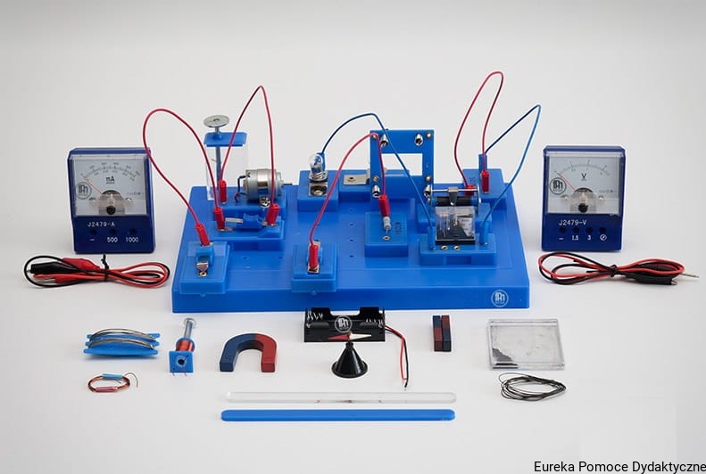 Zestaw dydaktyczny przeznaczony do demonstracji lub ćwiczeń z zakresu elektryczności i magnetyzmu.