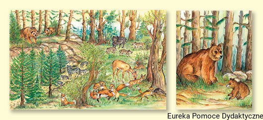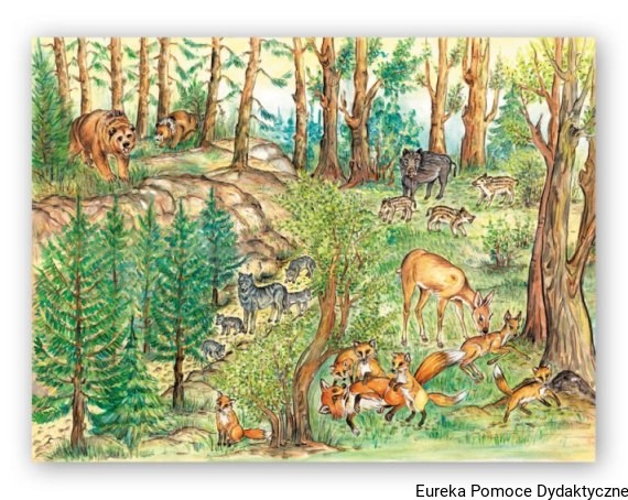 I. Plansza przedstawia las, a w nim zwierzęta: